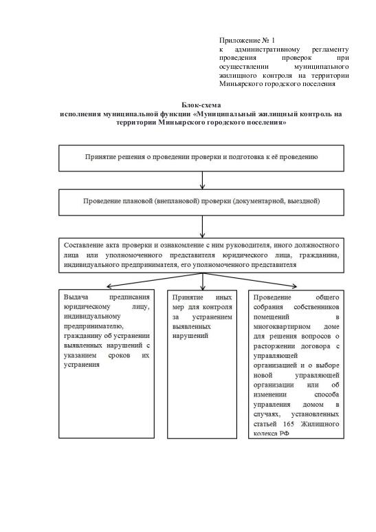 Блок-схема исполнения муниципальной функции муниципального жилищного контроля на территории Миньярского городского поселения приведена в приложении № 1 к настоящему Регламенту.